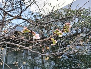 芽吹いているサクランボの木が工場の敷地内にあったので写真を一枚。