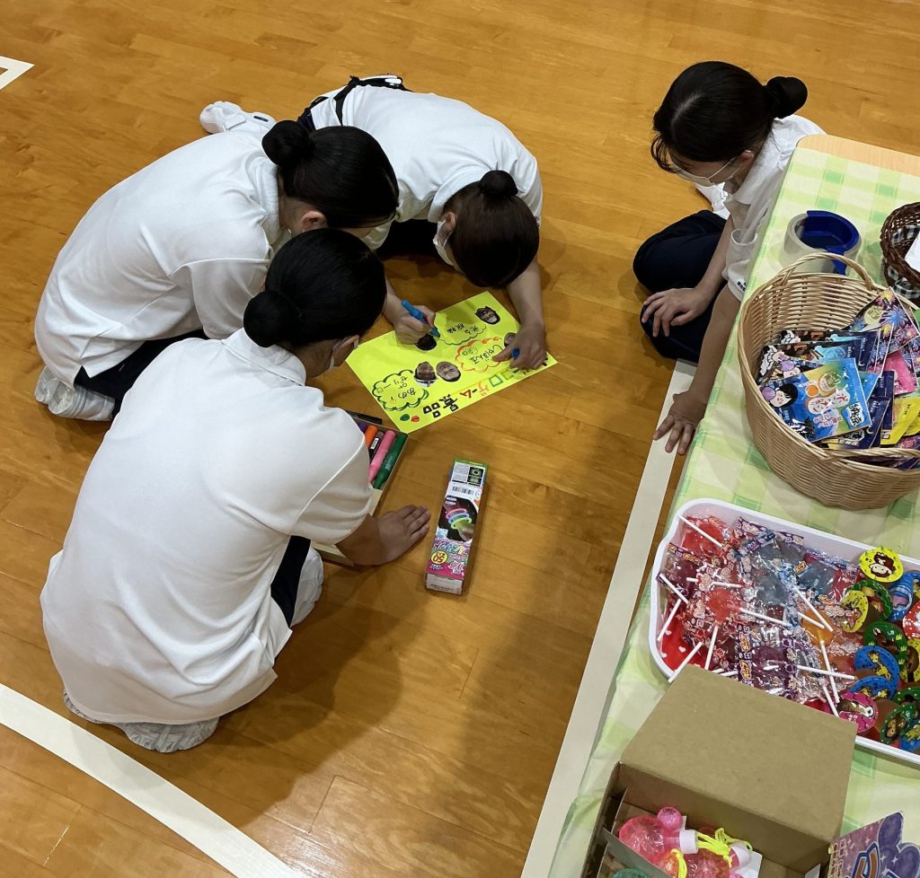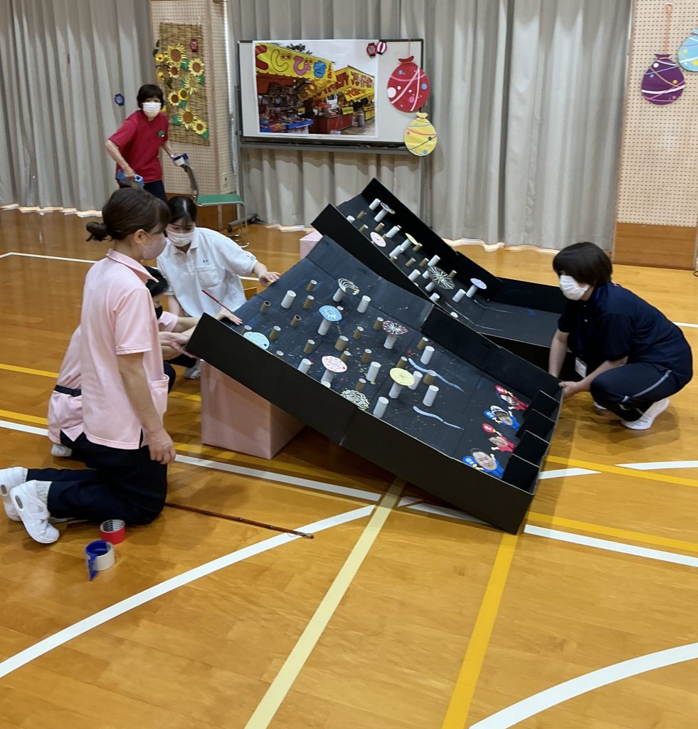 準備では、緑生館の看護学生さんもお手伝いくださり、景品メニューを書いたり、ビーコロの土台を作ったりと、真剣な表情で取り組んでくれました。