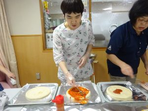 生地にソースを塗ったり、チーズや具材を盛り付けて、トースターで焼きました(^^♪