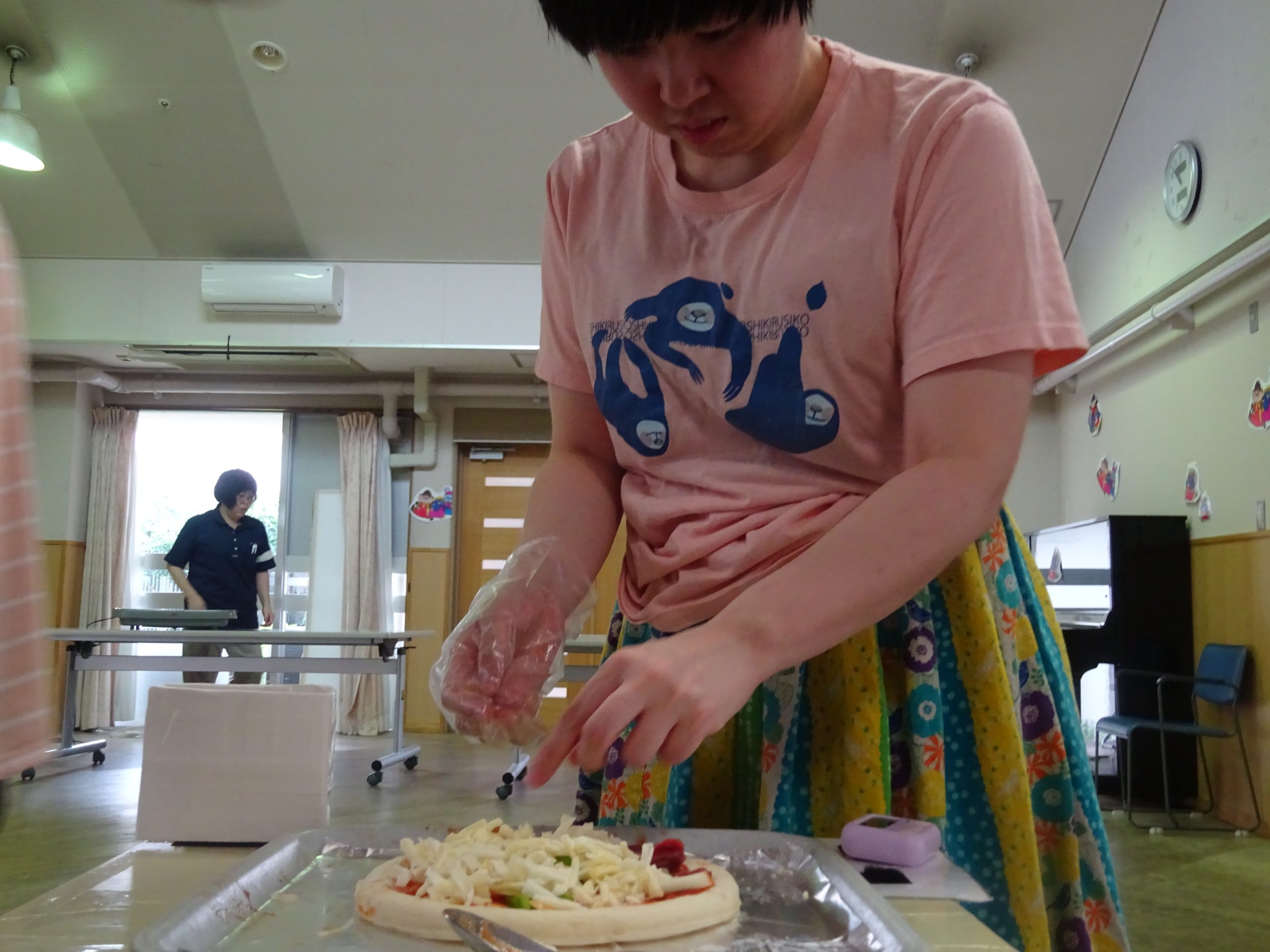 まずは、付け合わせの具材を炒めている様子です。ブロッコリーや人参等を調理しています。続いてはメインの紹介です。今回は”ピザ”を作りました。